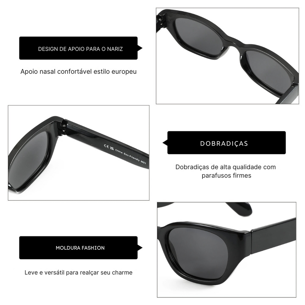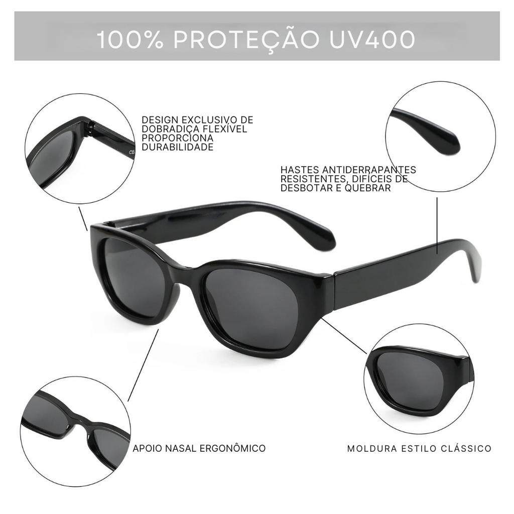 O óculos de sol feminino estilo gatinho é um clássico da moda que transmite charme, elegância e personalidade. Seu formato moderno valoriza diferentes tipos de rosto e é perfeito para quem busca um acessório que combina luxo e estilo atemporal.