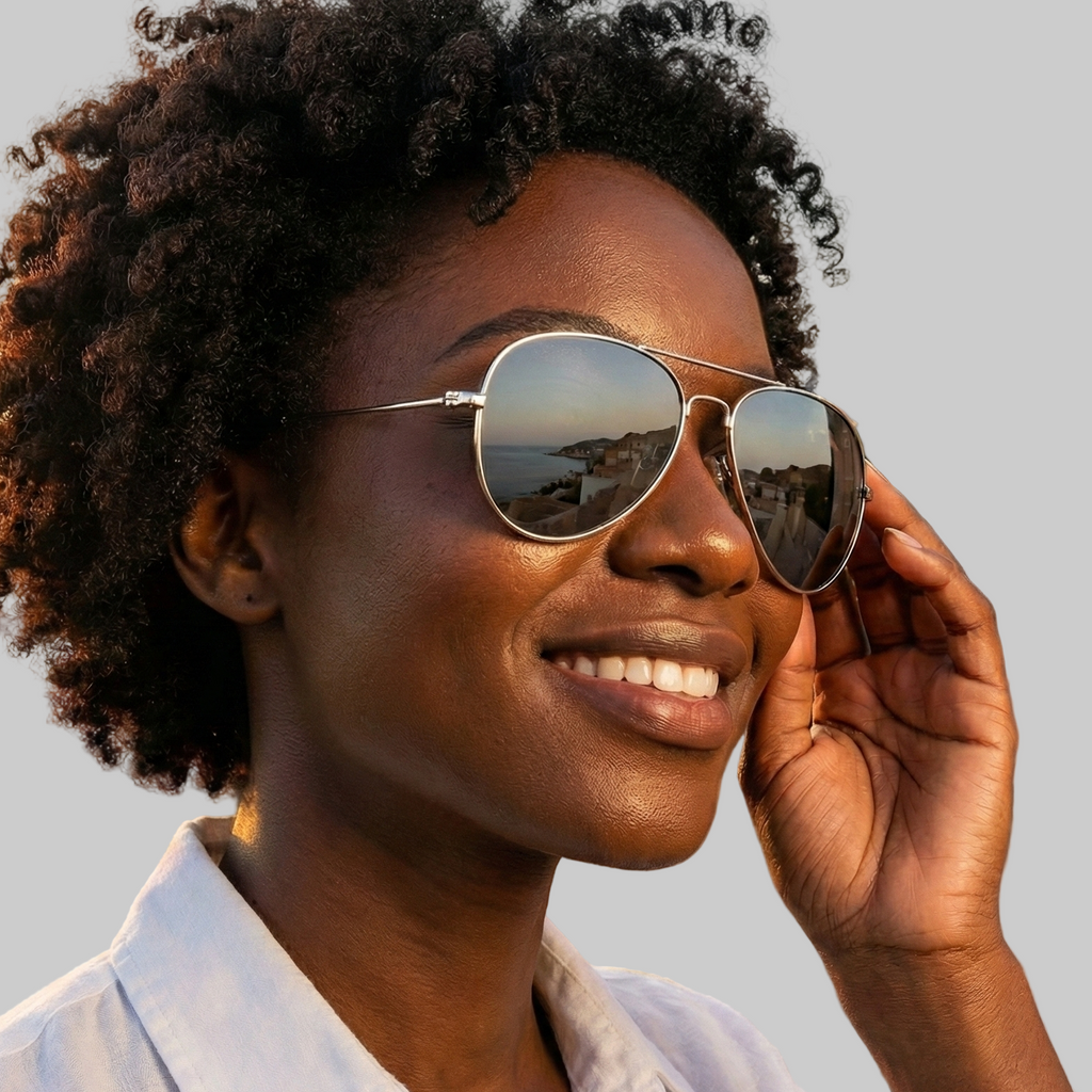Você coloca este óculos e, de repente, tudo fica mais bonito — inclusive você. O formato aviador suaviza, as lentes polarizadas fortalecem. Não é apenas estilo: é a sensação de finalmente ocupar o espaço que é seu.