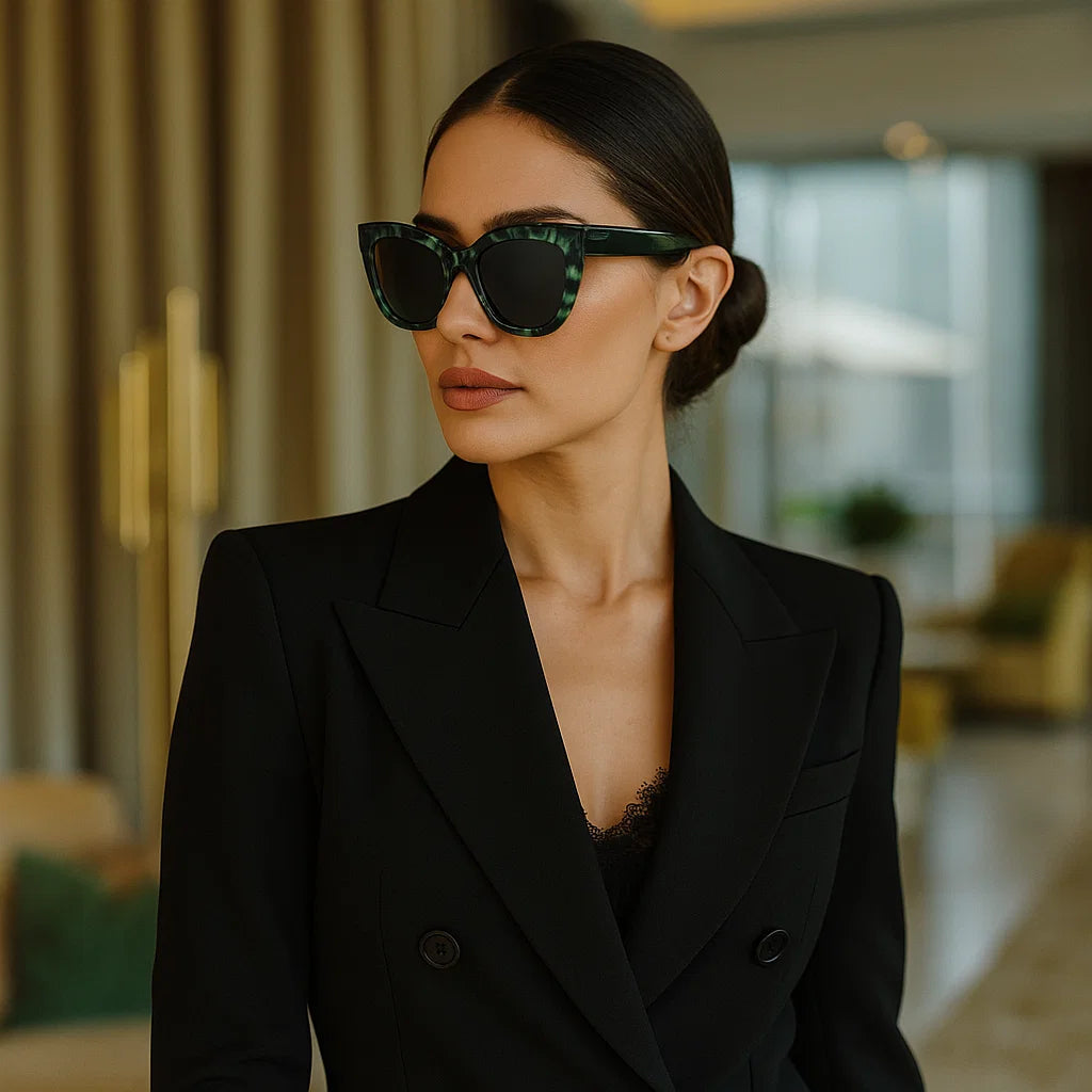 Leves e confortáveis, os óculos contam com hastes de 140mm e ponte de 17mm, proporcionando ajuste seguro e estável para diferentes formatos de rosto. O tamanho amplo das lentes em formato gatinho cobre bem a região dos olhos, unindo proteção e sofisticação.