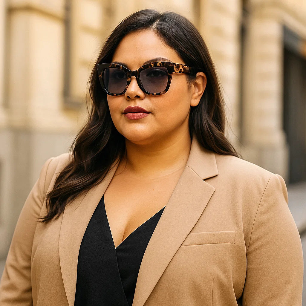 Leves e confortáveis, os óculos contam com hastes de 140mm e ponte de 17mm, proporcionando ajuste seguro e estável para diferentes formatos de rosto. O tamanho amplo das lentes em formato gatinho cobre bem a região dos olhos, unindo proteção e sofisticação.