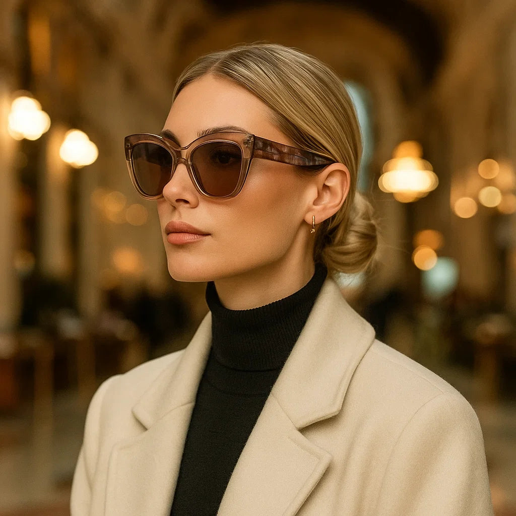 Leves e confortáveis, os óculos contam com hastes de 140mm e ponte de 17mm, proporcionando ajuste seguro e estável para diferentes formatos de rosto. O tamanho amplo das lentes em formato gatinho cobre bem a região dos olhos, unindo proteção e sofisticação.