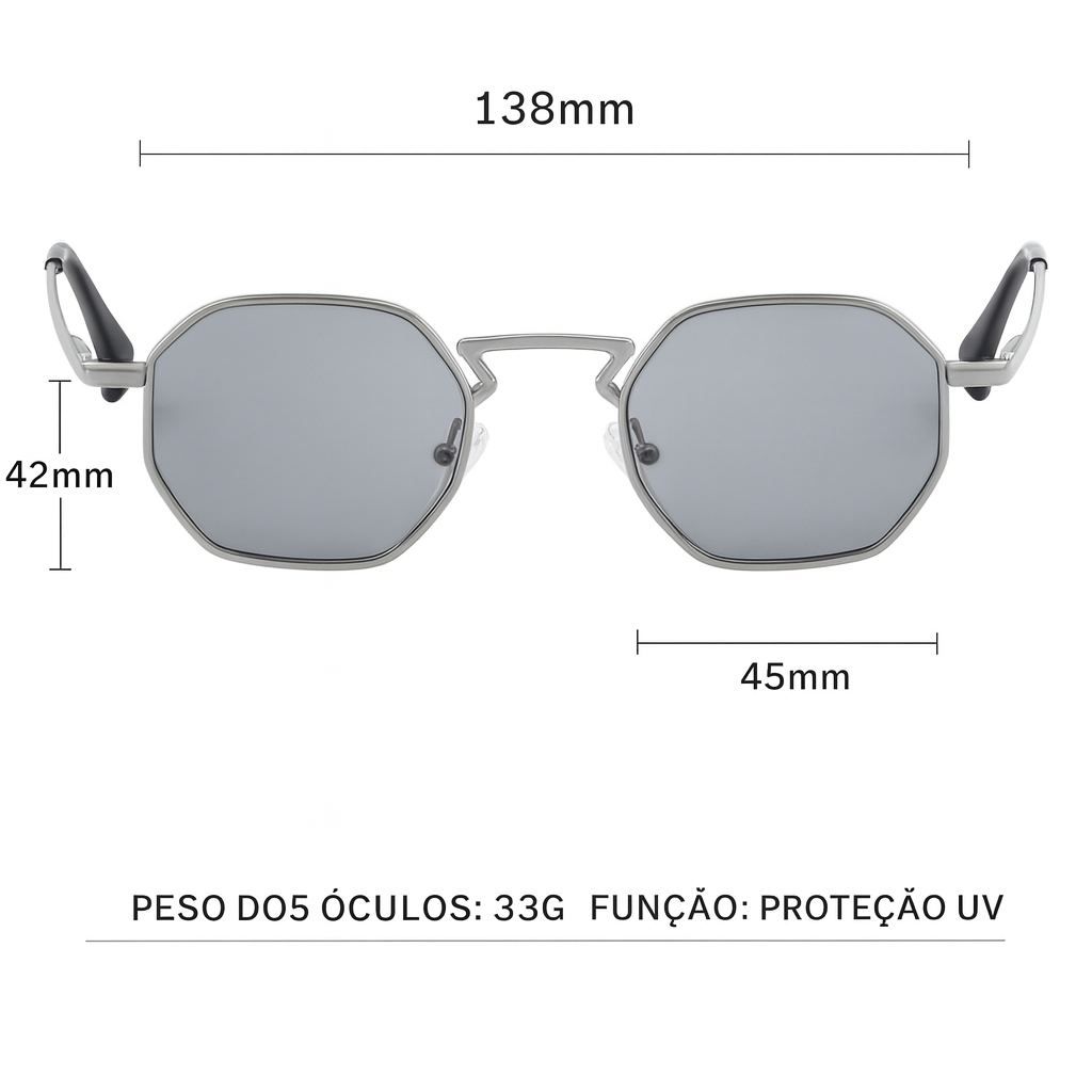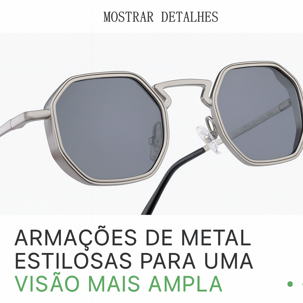 A fusão entre visual contemporâneo e elementos retrô cria um estilo autêntico e impactante. A armação em liga metálica oferece durabilidade, resistência e toque premium — ideal para quem deseja um acessório sofisticado e funcional.