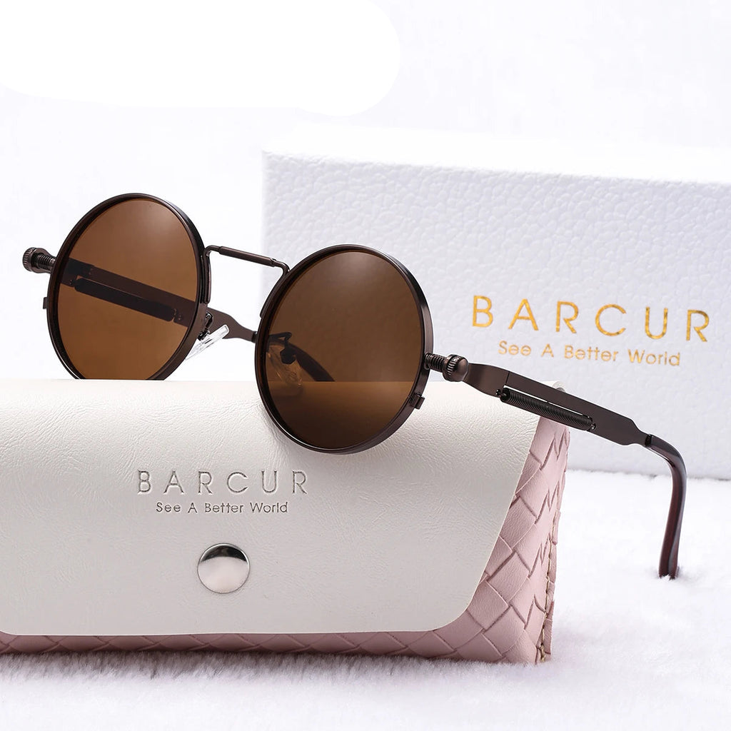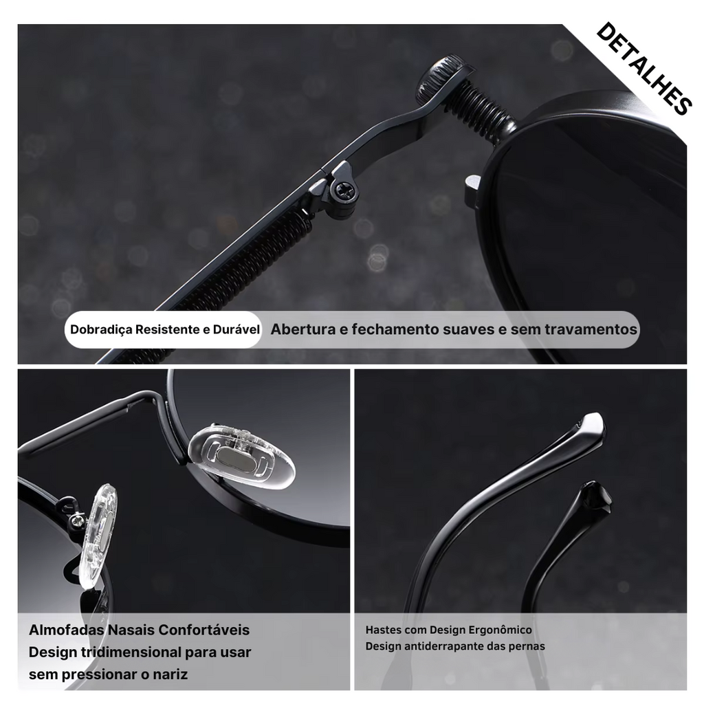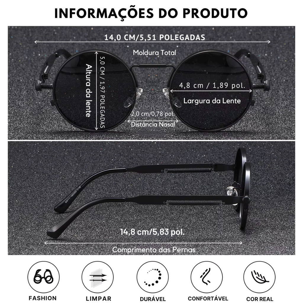 O óculos de Sol Redondo Feminino Fotocromático é inspirado no design steampunk circular, este modelo traz um visual único e sofisticado. A armação em aço inoxidável garante durabilidade e acabamento premium, enquanto as hastes com detalhe de mola oferecem maior conforto e ajuste seguro para diferentes formatos de rosto.